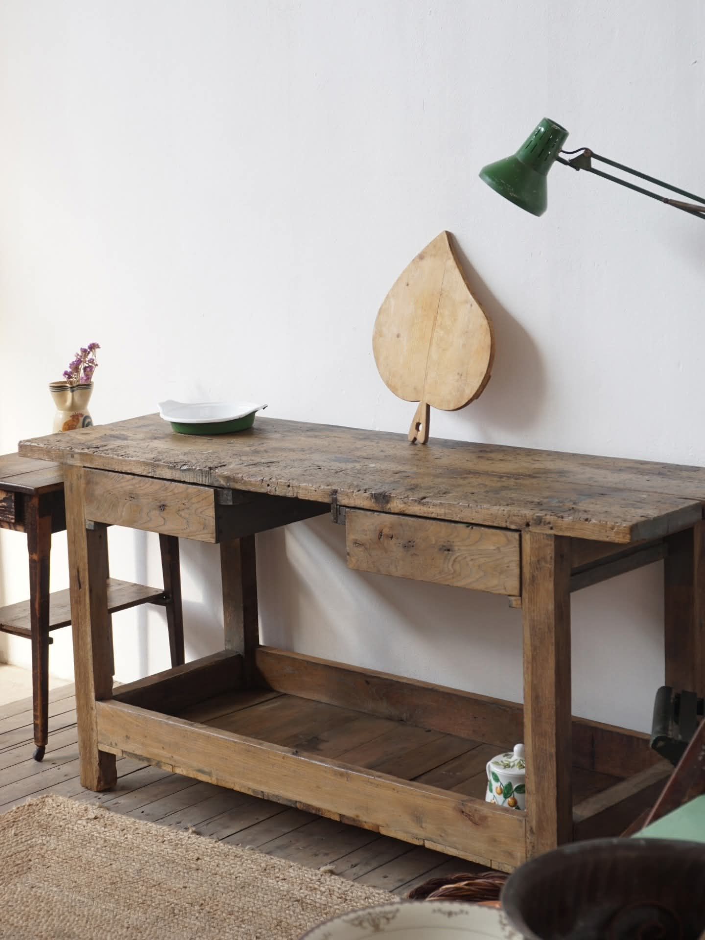 Vecchio bancone da lavoro in legno massello con comodo ripiano inferiore.