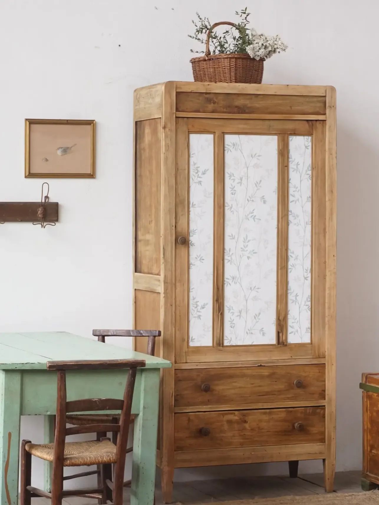 Il pannello frontale dell'anta, viste le condizioni, è stato risanato e coperto con una carta da parati dai colori tenui e delicati che ben si accostano al colore naturale del legno.