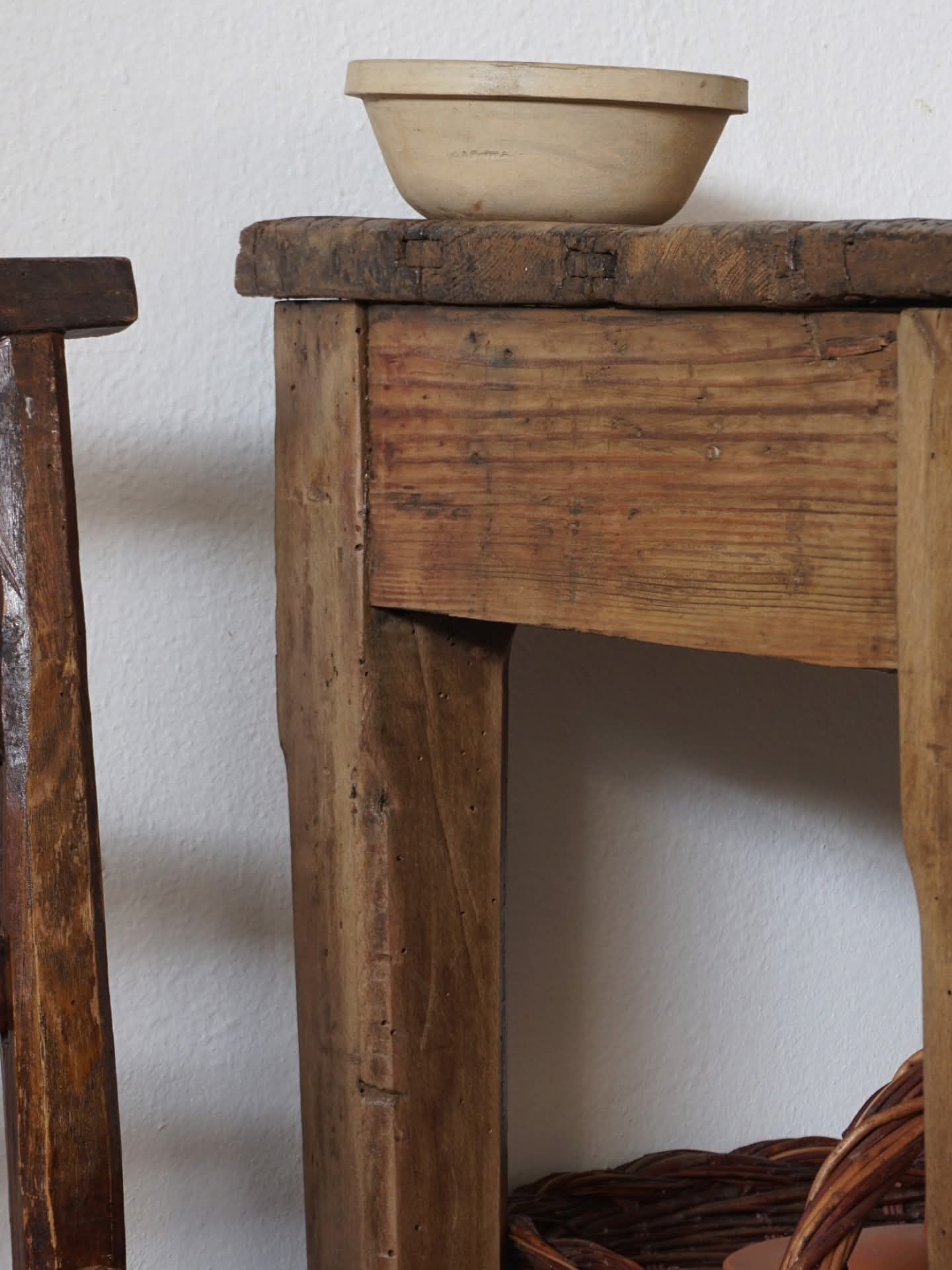 Piccolo banco da lavoro in legno, robusto e compatto.